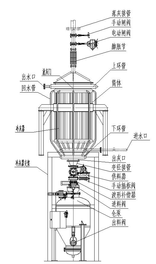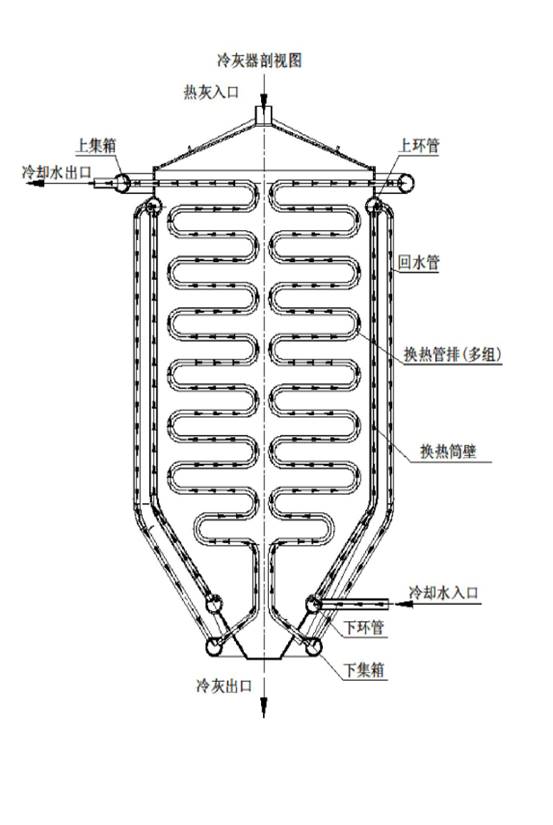 工作原理:高溫?zé)峄以谥亓ψ饔孟卵剡M(jìn)灰管進(jìn)入冷灰裝置筒體,在進(jìn)灰管與冷灰裝置筒體之間,安裝有進(jìn)灰膨脹節(jié),此膨脹節(jié)可吸收進(jìn)灰管高溫產(chǎn)生的位移。筒體內(nèi)分布多層多列蛇形管并通冷卻水,熱灰通過換熱管同凝結(jié)水進(jìn)行熱交換,實(shí)現(xiàn)高溫積灰的冷卻。冷卻后的熱灰,進(jìn)入出口下方的倉泵,再經(jīng)過氣力輸灰裝置將冷卻后的積灰運(yùn)往灰倉,使原本污染嚴(yán)重的排灰系統(tǒng)變得干凈整潔環(huán)保。熱灰是在重力作用下呈自然流動狀態(tài),對立式冷灰器的筒體內(nèi)壁、筒體內(nèi)換熱管的磨損極輕,因此立式冷灰器中參與與熱灰進(jìn)行熱交換的各部件的壽命就能夠保證。
